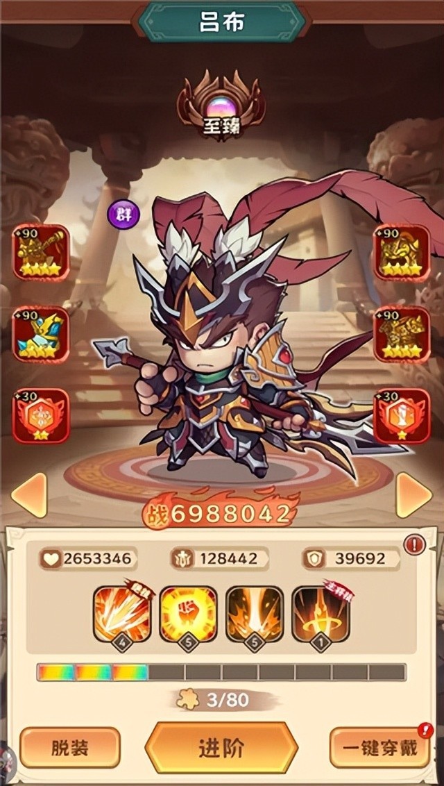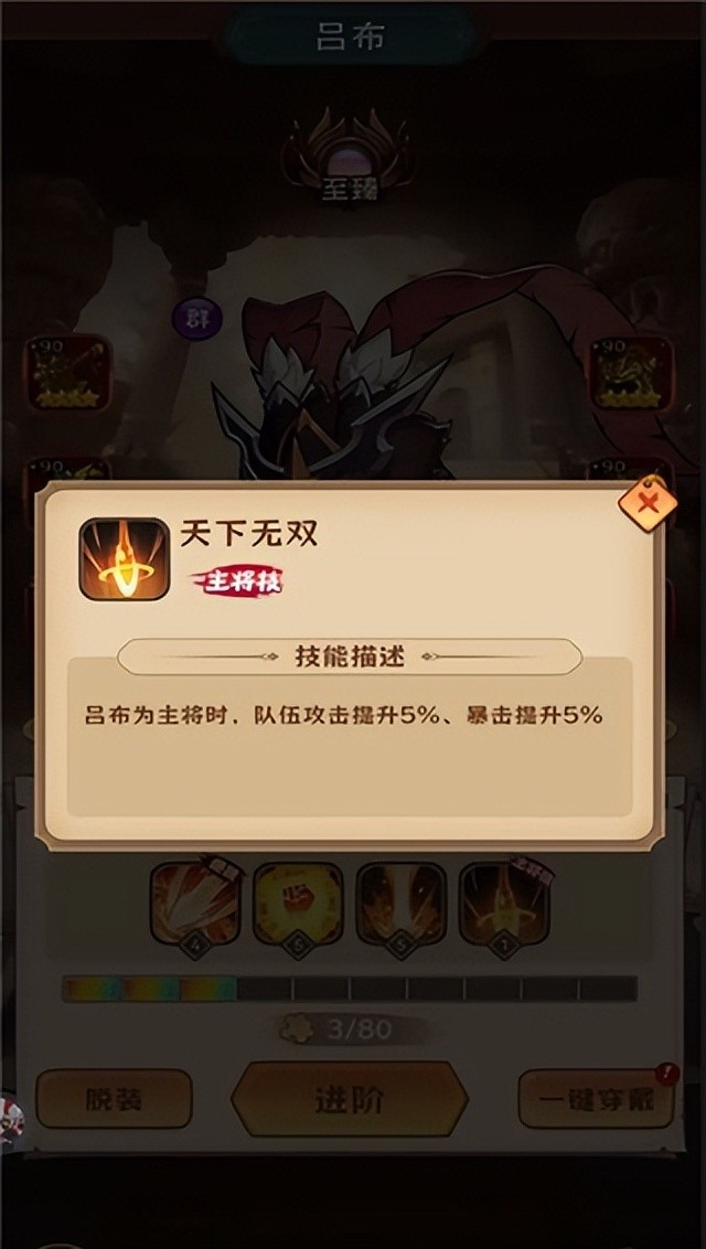 绝技:虎痴(大幅提升攻击力、生命值和暴击)最高可获得40%攻击力提升、20%生命值提升、暴击提升15%