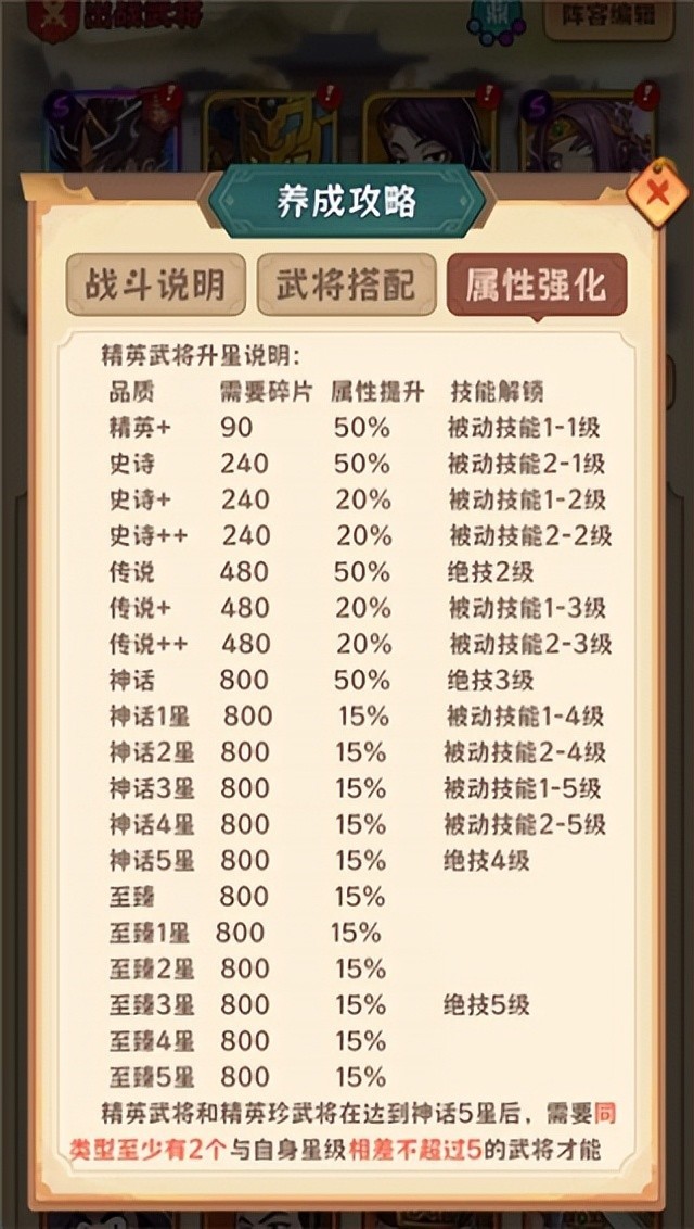 武将养成是这个游戏的核心内容 一共需要上阵4个角色。PVP玩法要练7个 区分主将和队员 主将会具备主将被动技能 一般为增加一定比例的 伤害 暴击率 移动速度