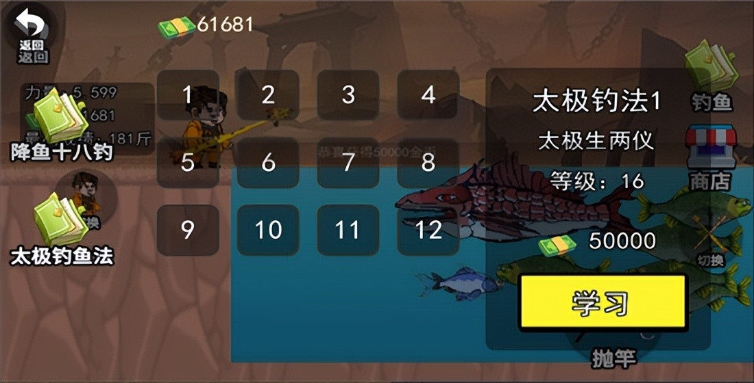 玩家可以通过学习钓鱼法来提升钓鱼技巧