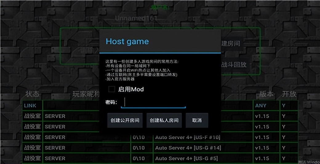 三、点击右方的创建房间,输入密码,选择创建公开房间或私人房间