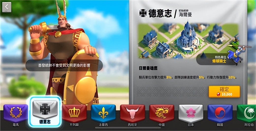 玩法解析:德意志日尔曼雄鹰文明非常注重战斗力。由于骑兵攻击力和部队训练速度的增加,你的军队可以更快地集结并参与战斗。同时,行动力恢复速度的增加也可以让你更快地执行各种战斗和任务。这种文明适合那些喜欢战斗和征服的玩家。