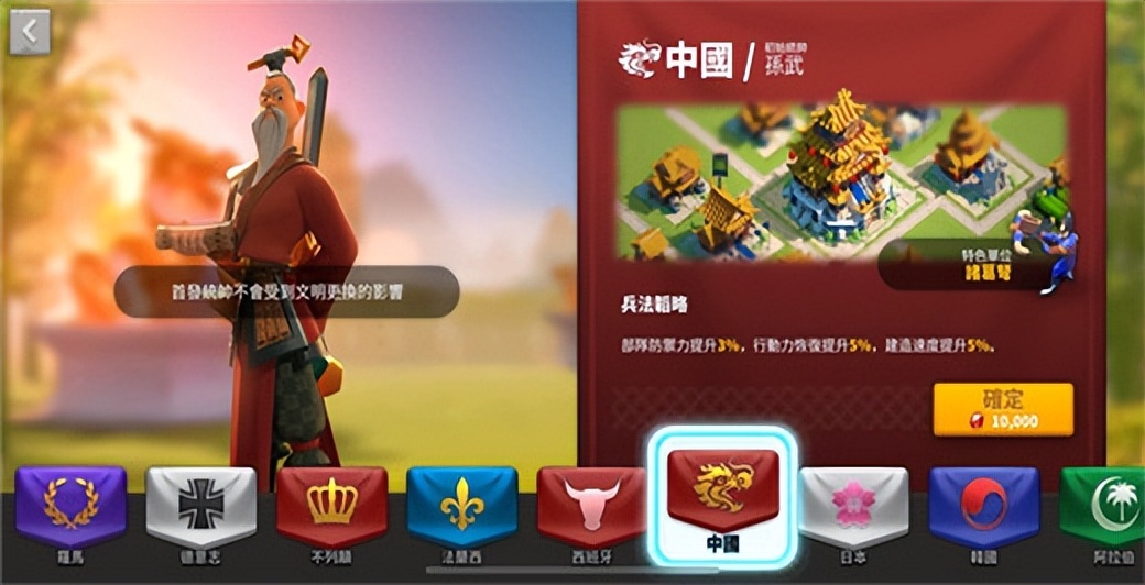 玩法解析:中国兵法韬略文明非常适合于早期快速发展和建立优势。部队防御力的增加可以提高军队的生存能力,让你的军队在战斗中更耐久。行动力恢复速度的增加可以让你更快地进行战斗和任务,提高作战效率。建造速度的增加也可以让你的城市发展更快,更容易建立强大的实力。适合那些喜欢快速扩张和建立帝国的玩家。