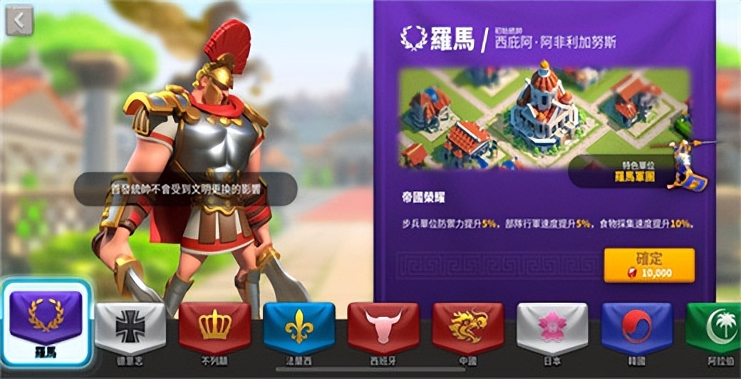玩法解析:罗马帝国文明具有很高的步兵战斗力和快速的资源收集能力。你可以使用罗马步兵参与防守,通过步兵防御力和部队移速的加成,可以更好地控制战斗节奏。同时,食物采集速度的增加也可以帮助你更快地收集资源,提升城市的发展速度。