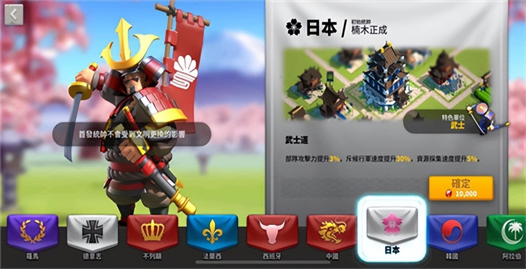 玩法解析:日本武士道文明适合那些注重全面发展的玩家。部队攻击力的增加可以提高军队的输出能力,让你的军队在战斗中更具威力。斥侯移速的增加可以让你的斥侯更快地进行侦查和收集情报,更好地掌握战场情况。资源采集速度的增加也可以让你的资源获取速度更快,更快地发展经济实力。