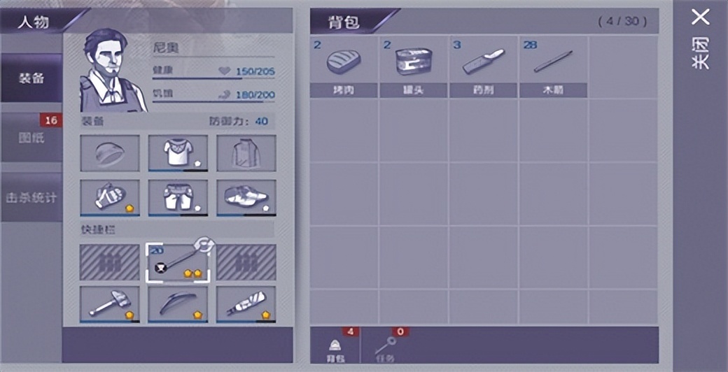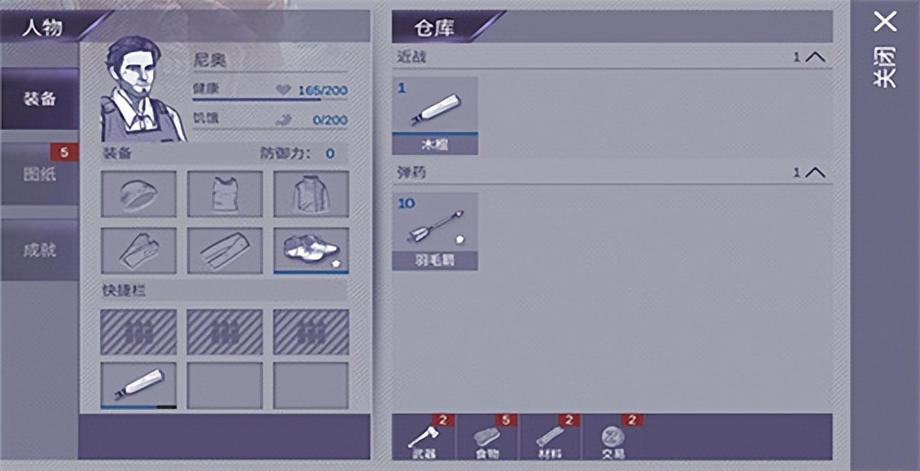 在Neil仓库右侧的装备栏中,会收纳好玩家在户外探险收集到的所有资源,根据武器、食物、材料、交易四大块分类。