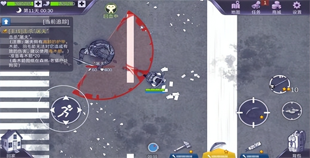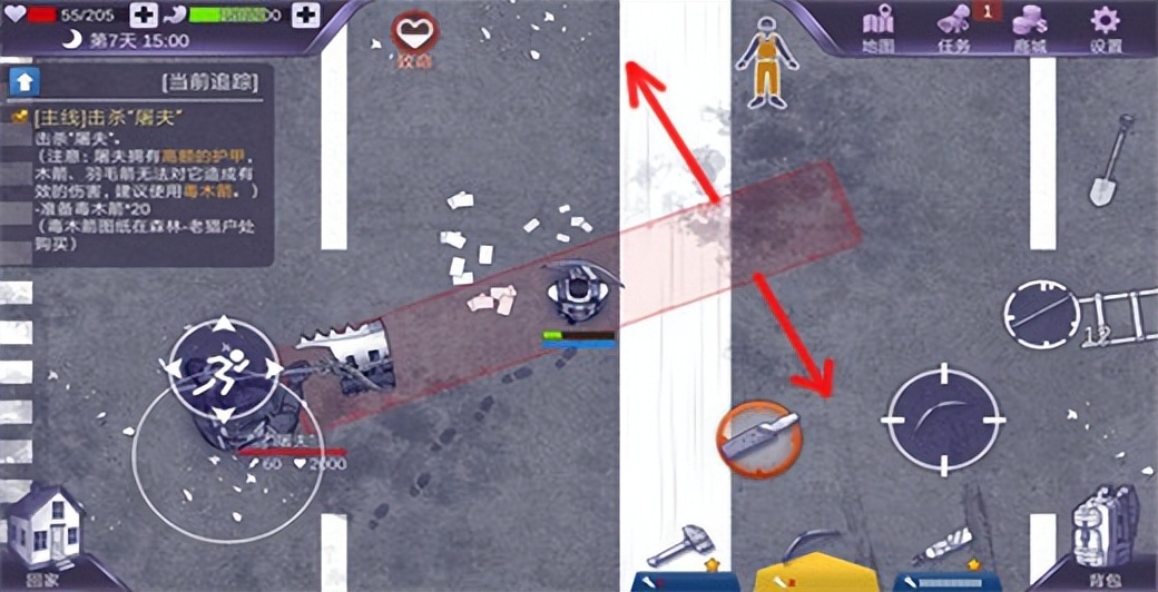 屠夫第二个技能是冲锋攻击,地上也会提前出现攻击印迹,我们先远离屠夫,然后在攻击印迹较远的地方向攻击印迹两边垂直移动,这样屠夫冲过来的时候,我们就能走出印迹区域了。同样屠夫在发动冲锋技能后,也会有停顿,我们在这个时候用毒木箭攻击它,然后继续走位即可。
