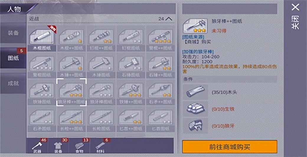 在图纸栏中资源的分类就有区别于之上了,主要是根据武器、装备、食物、材料分为四大类。其他三项的具体内容刚刚都有提到过,那么余下的这个装备呢就是玩家自己的衣服、手套、裤子、鞋子,增益效果主要是防御力和移动速度的提升,作为一款极其有代入感的微操玩法游戏,在面对怪物时,灵活的走位,有技巧的闪避,都是可以大大降低玩家自身的损耗,移动速度的增加无疑是一项多多益善的好事。