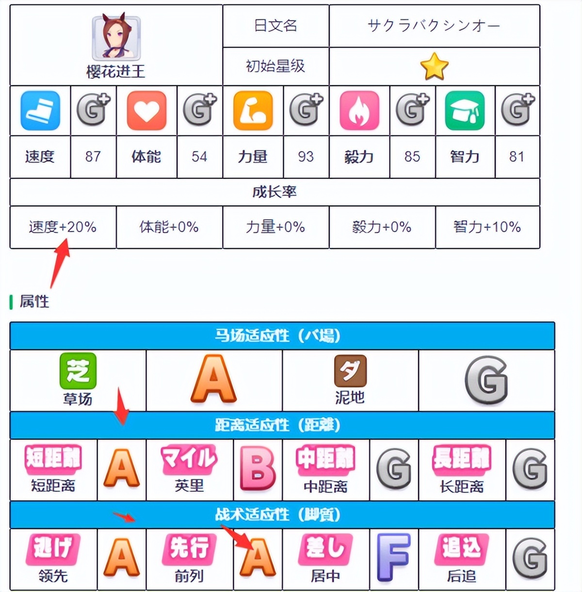 这张图表标注了成功培养所需的重要属性值条件。根据这些条件,我们需要对马娘展开有针对性的训练。初期环境中,以纯属性优势突出的逃马(非考虑技能流)稍显优越。最后,在讲到马娘个体培育时,通常前期推荐使用低星级马娘,相较于高星级马娘而言,它们培养难度更低,目标易达同时有助于前期剧情过渡。新手马娘育成推荐——樱花进王春丽樱花进王,她本身拥有不错的初始属性,对训练的适应性尤为出色,尤其是速度方面。在前期短距离比赛中可以积累众多粉丝,但在后期可能因连续比赛导致体力不堪负荷。在提升速度的同时,可以适度提高智力来学习新技能,总体而言,培养策略是简明的速度+短距离+冲刺技能组合。