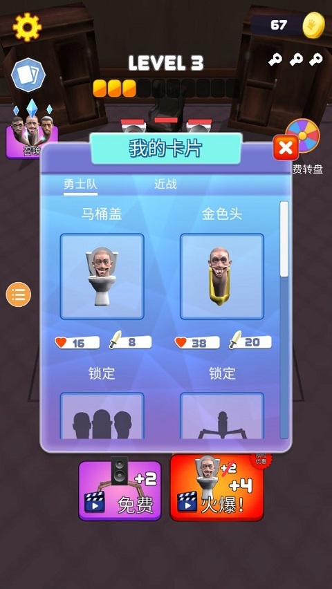 马桶人大战监控人游戏正版是一款结合了自走棋策略、合成以及闯关元素的趣味休闲手游,而且这款游戏将熟悉的玩法元素融为一体,玩家可以根据卡片的属性进行战术布局,并通过升级合成强化角色,构建最强战队。与此同时,这款游戏提供多样的场景和挑战,玩家可以自由选择体验,穿越各种奇幻场景,你会遇到许多未知的敌人,要想在接下来的战斗中立于不败之地,玩家需深入了解每张卡片的攻防属性。值得一提的是,游戏关卡丰富,奖励系统完善,玩家可以通过收集近战和勇士队成员的卡牌图鉴,了解详细的数值信息,马桶人大战监控人游戏正版为玩家提供了充满魔性的冒险体验,你可以选择扮演马桶人或监控人,与敌人展开激烈的战斗。