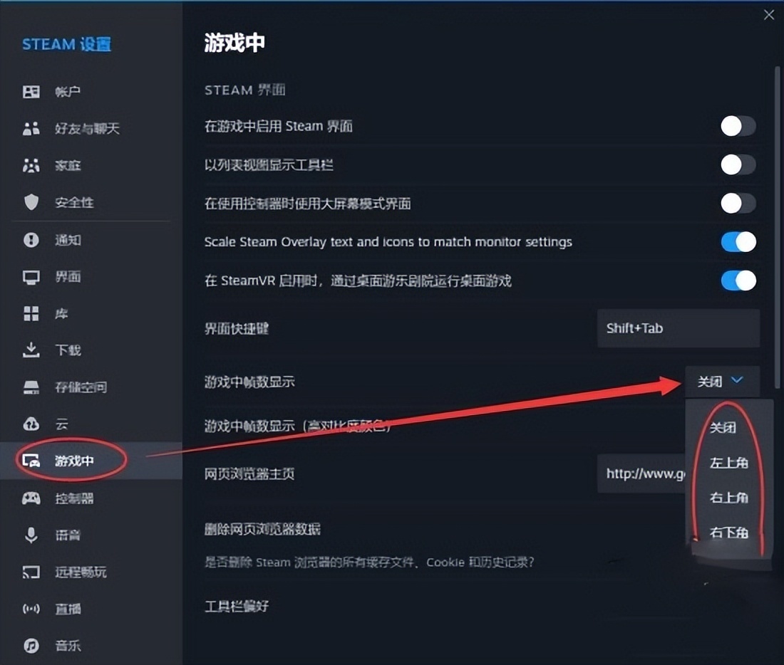 在Steam设置中,找到“游戏中”的“游戏中帧数显示”设置。