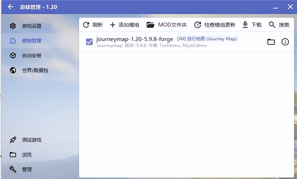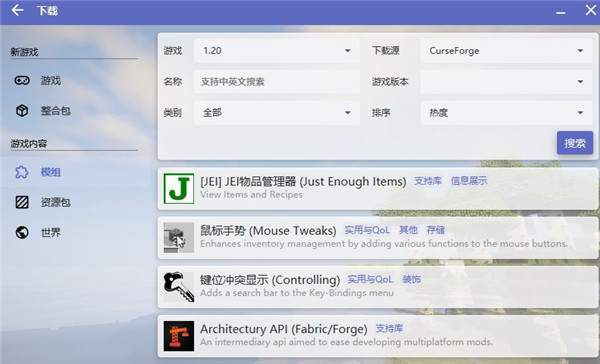 选择“模组”选项,在模组界面搜索并下载所需模组。
