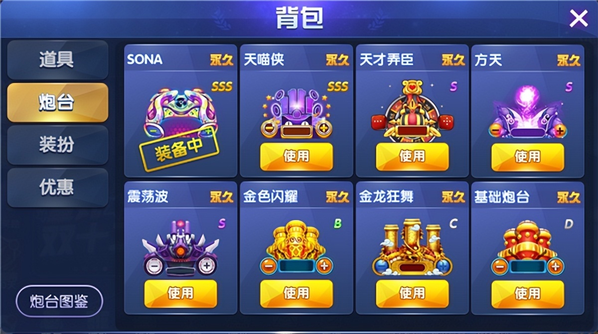2、炮台切换:不同的炮台有不同的特性及技能。可在捕鱼房间中,点击“炮台”进入“更换炮台”系统即可预览所有炮台的特殊属性,根据捕鱼场次需求更换炮台。