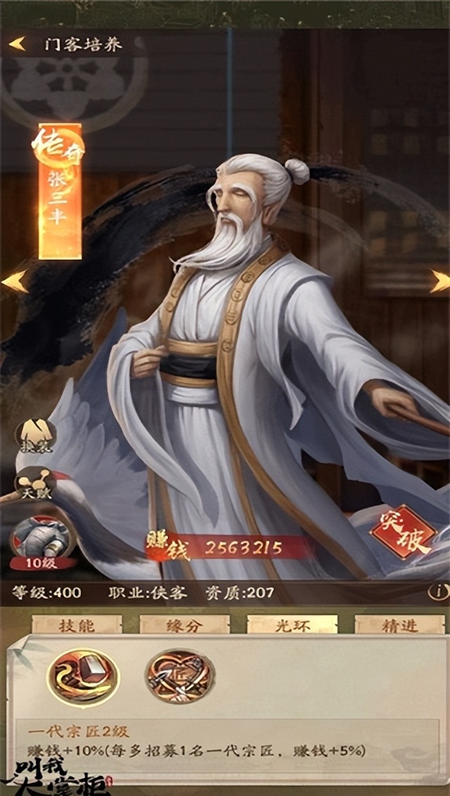 15、 挚友方面,每个技能用许愿石升级一遍,这样提高很多赚速。算盘给所有门客均匀的升级到需要3个算盘为止,其他的堆在一个门客身上,放在商会里。