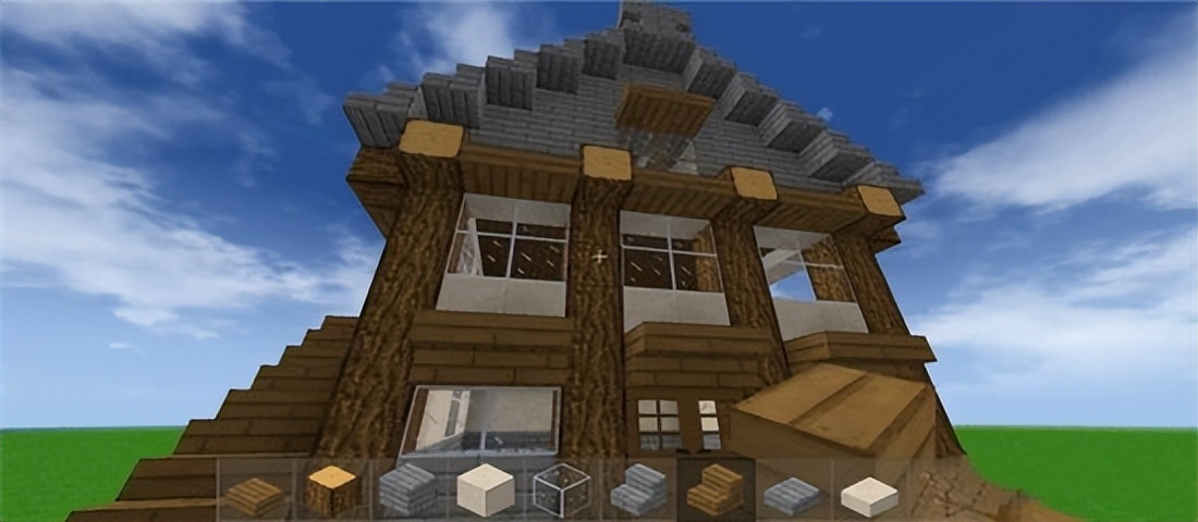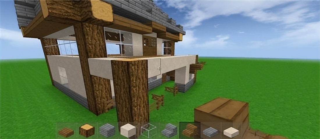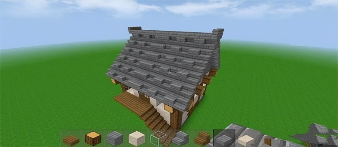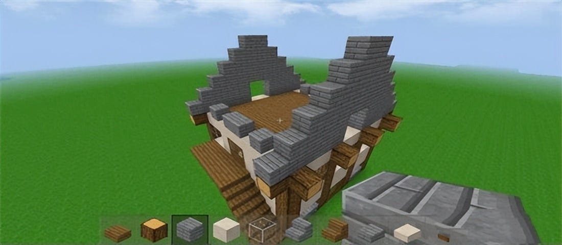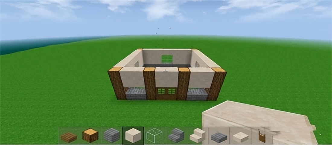 拐角用木头,墙底用石头,墙体用另一种颜色的方块,地板和天花板用木制半砖。此时会建造出一个火柴盒,然后用木台阶在屋外一侧建造楼梯。