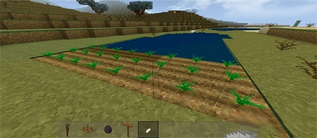 在没有围的那一面挖一条水道,一头放箱子,另一头放一格水。然后在对面建造蓄水池(用活塞当闸门,活塞设为6格)。最后将整个农田用栅栏围起来,防止动物进入踩坏耕地。