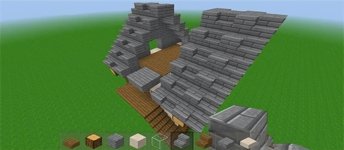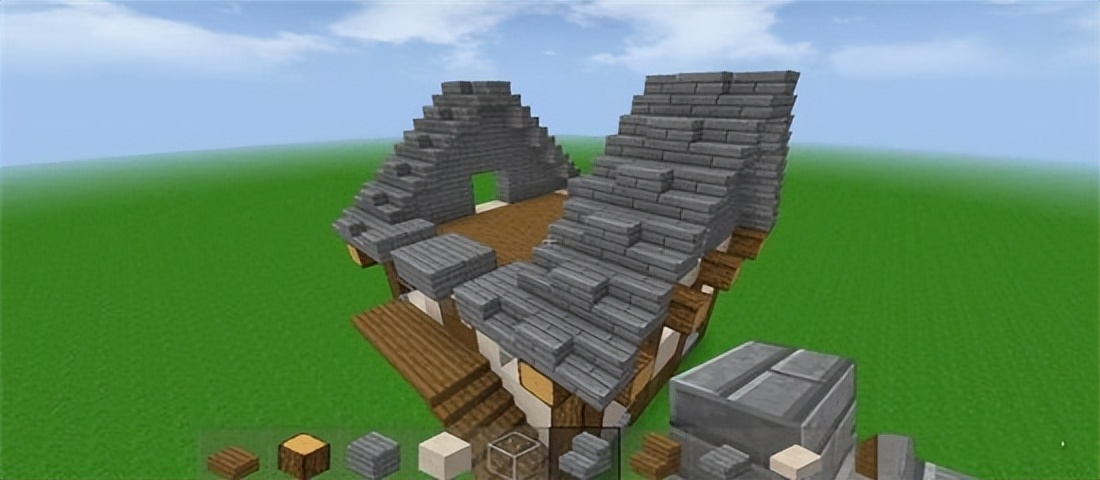屋顶用石砖和石砖台阶建造。先将木头向外延伸一格,然后将石砖和石砖台阶交错放置成瓦片屋顶。