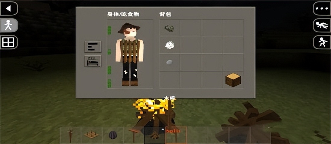 动物在夜晚具有更强的攻击性,但不会主动靠近篝火。如果入夜后还没找到庇护所,待在篝火旁也比较安全。篝火只能燃烧一段时间,需要添加木棍等燃料才能持续燃烧(篝火燃烧时间约为68s)。熄灭的篝火无法再次点燃,挖掘后不会掉落任何物品,可以当作标记来使用。