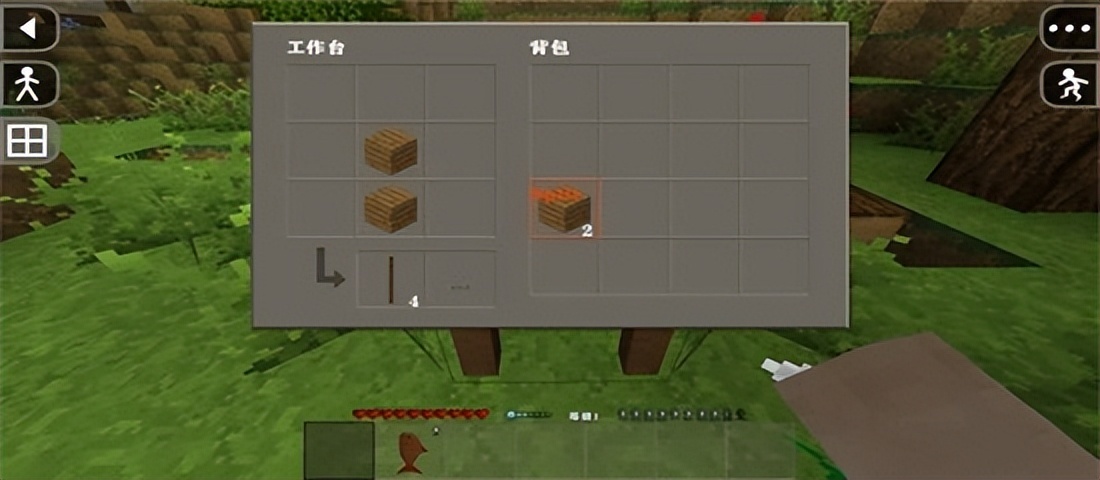 砍树(长按左键)获取木头和树叶,获得两个木头后先合成工作台(右键放置工作台)。