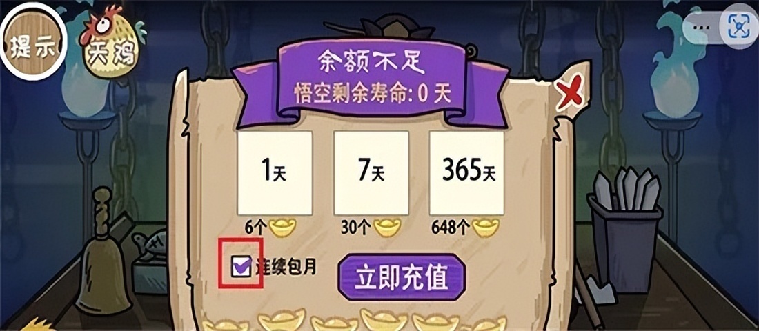 通关技巧:使首先将阎王头上的帽子拉到生死簿上,然后会出现充值界面,点击连续包月前面的方框打上√,最后点击立即充值即可。