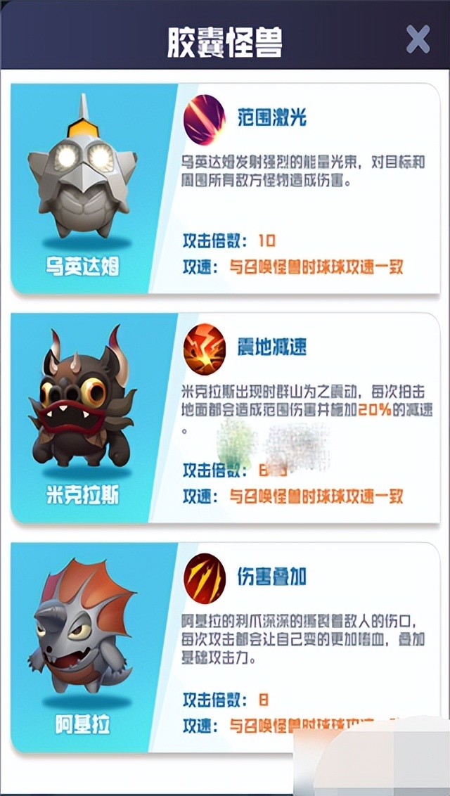 2、有3种胶囊怪兽,分别是乌英达姆、米克拉斯、阿基拉,各自都有不同的攻击效果