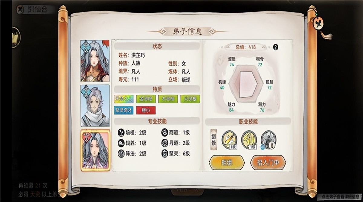 3、弟子资质并非决定性因素,重要的是看其天灵根、圣体等特质,可以根据具体情况选择。