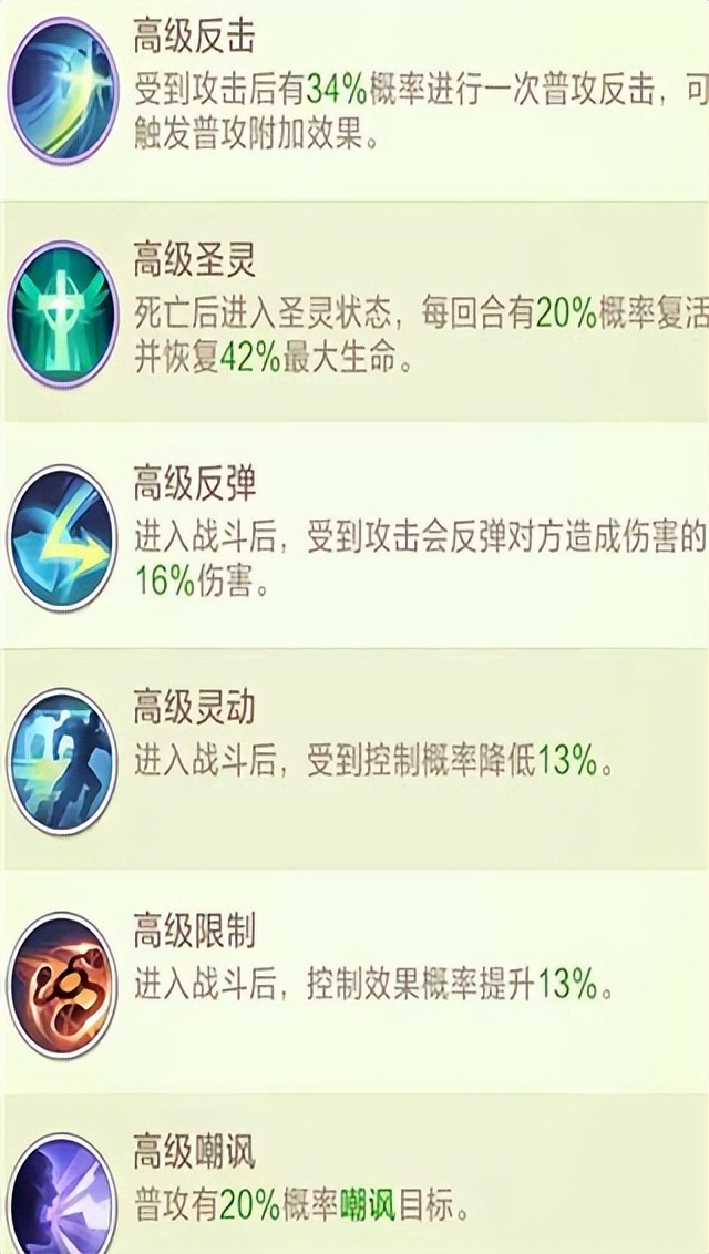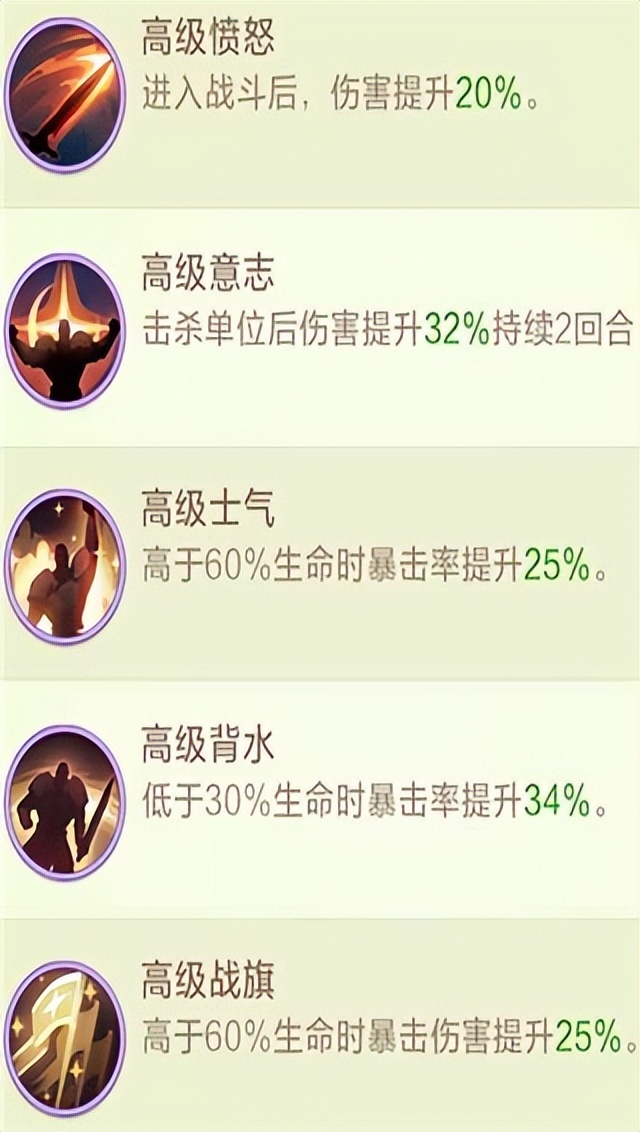 狗头:极速 反击 愤怒 士气暗刺:愤怒 狂怒 意志 士气女武:极速 士气 战旗 愤怒猴子:极速 士气 战旗 愤怒霸剑:搏命 背水 虹吸 圣灵双子:亲和 净化 急救 庇佑傀儡:亲和 反击 急救 净化月灵:极速 急救 愤怒 吸血龙枪:急救 圣灵 净化 饮血毁灭:极速 吸血 愤怒 坚韧兔子:极速 急救 生机 包扎时光:亲和 净化 急救 庇佑冰盾:反击 急救 包扎 生机熊猫:急救 嘲讽 生机 净化