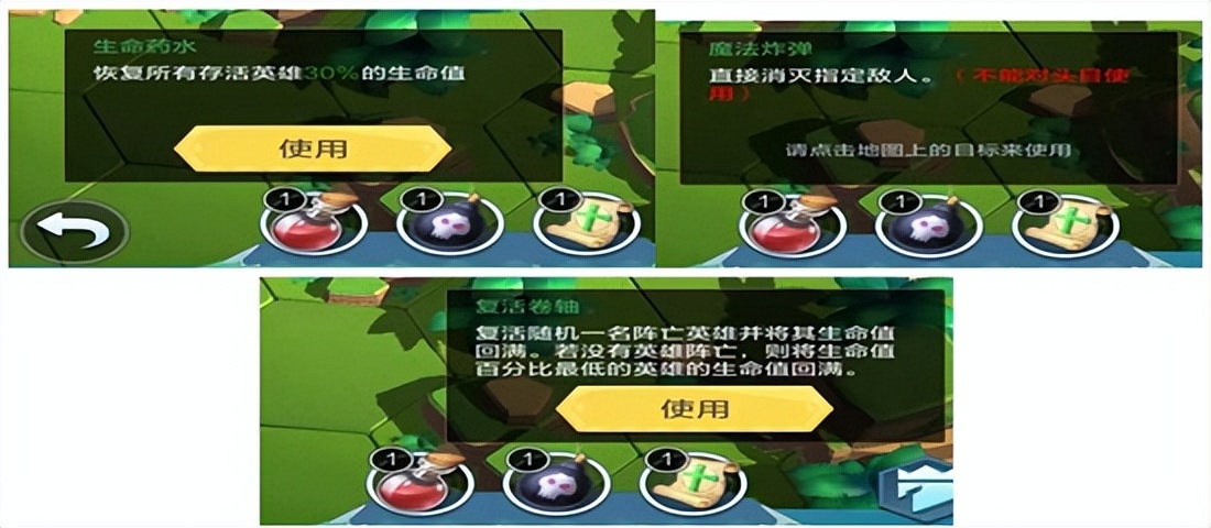 答:目前我遇到的主要是三类道具,生命药水(回血30%)、魔法炸弹(炸掉拦路怪物)、复活卷轴(复活一名阵亡英雄)。可能后续会有更多道具,目前我遇到的就只有这三个,最好用的是魔法炸弹,一弹必杀!