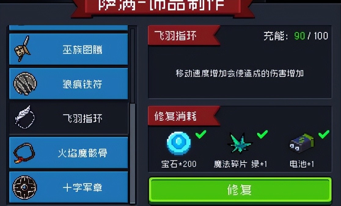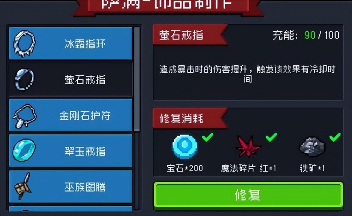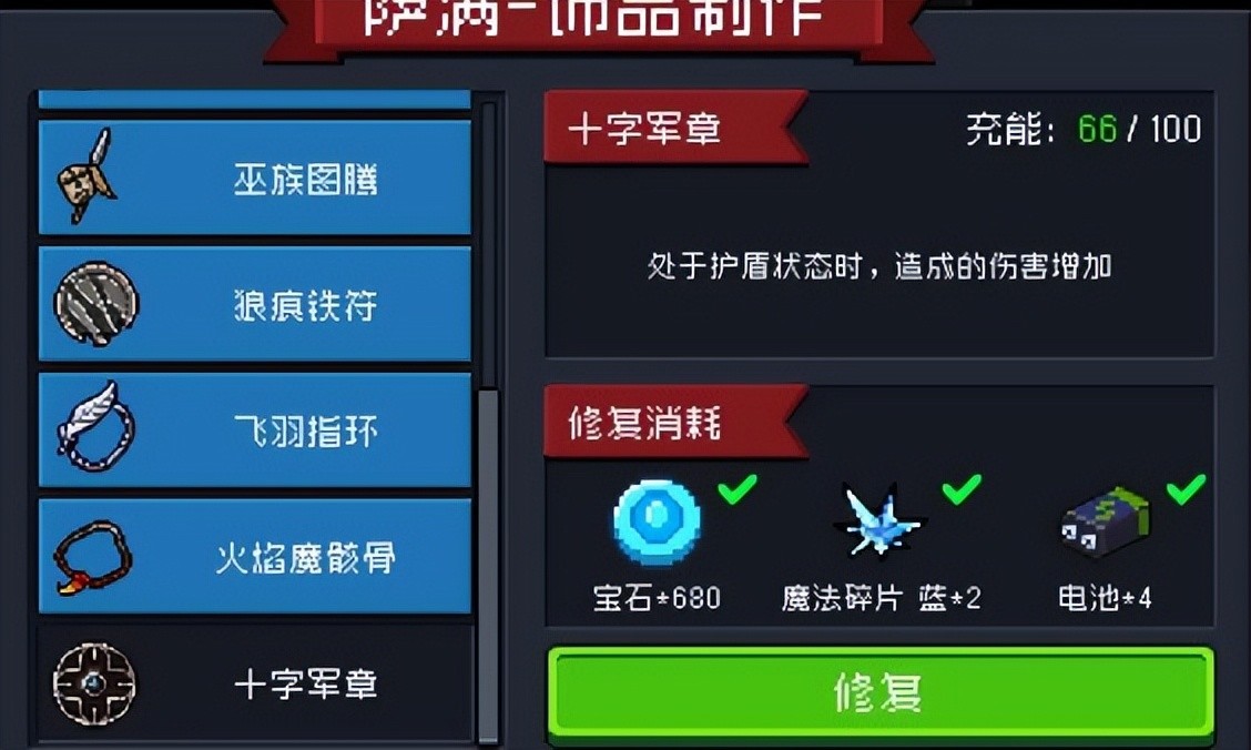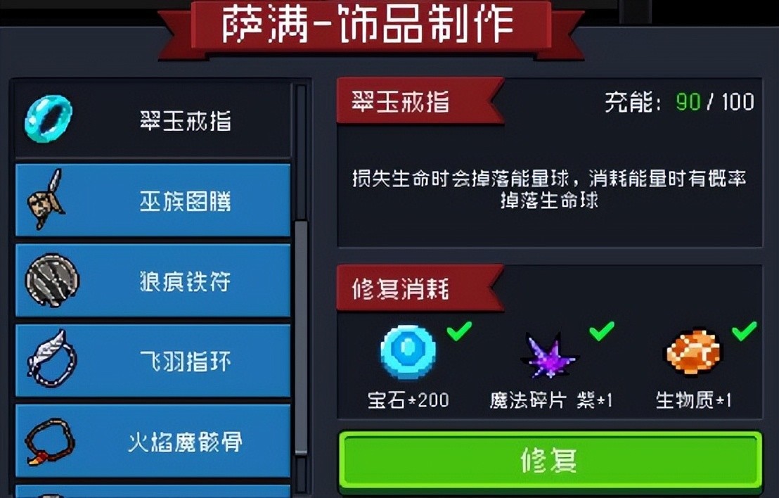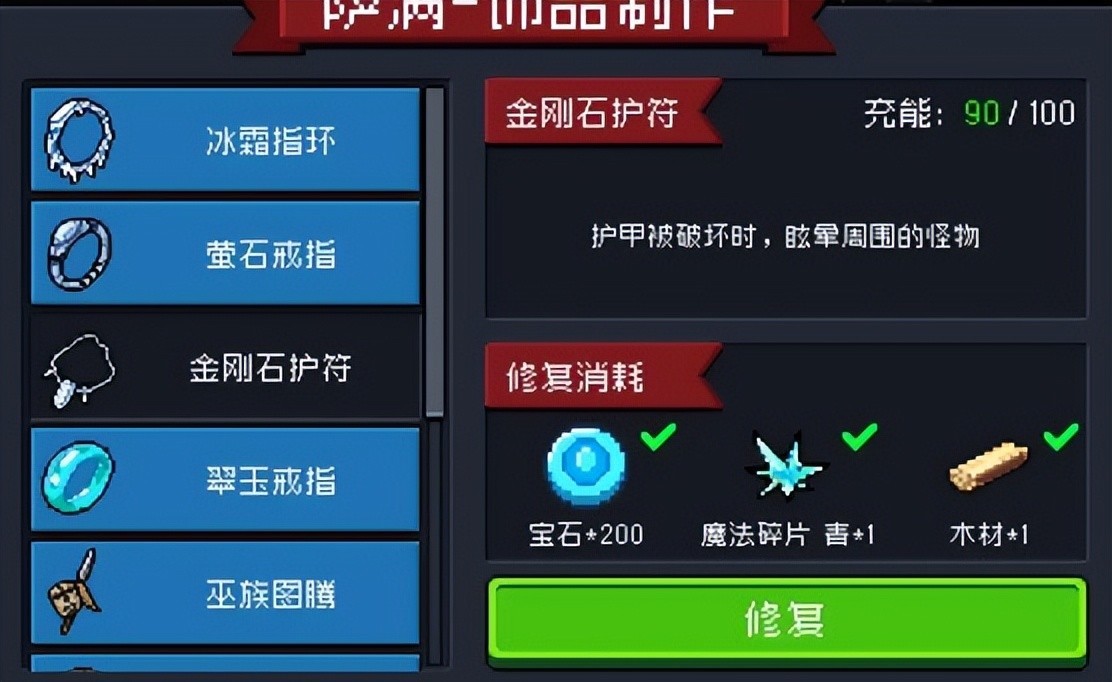 所以建议大家等饰品耐久耐久掉了至少二十点之后再去修复,其实一直用到耐久为零再一次性修复全部是最好的。因为这样不会让魔法碎片修复的耐久溢出。