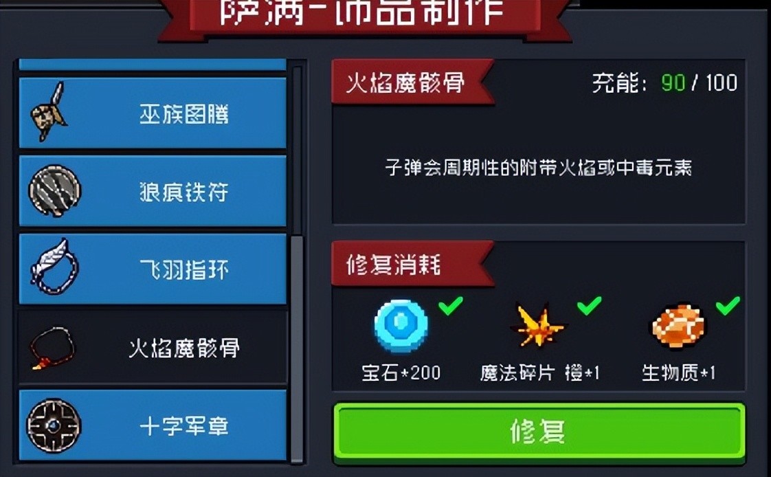 增伤类饰品,让子弹附带燃烧或中毒效果,伤害还算不错,典型可以锦上添花却不能雪中送炭的饰品。伤害下限不低上限不高,比较中庸,但总体来说还算不错,几乎没有限制,只要有弹幕就能触发。大多数情况下比巫族图腾强,甚至在饰品中的通用性仅次于翠玉戒指。