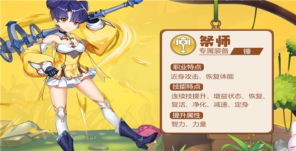 某种意义上跟法师很像,却并不是输出职业,更偏向保护队友,虽然身板也比较脆,但是续航能力很高。缺乏进攻性能的她,也比较依赖队友造成输出,无论是战士还是法师都是她的好朋友,属于是游戏里的传统奶妈。
