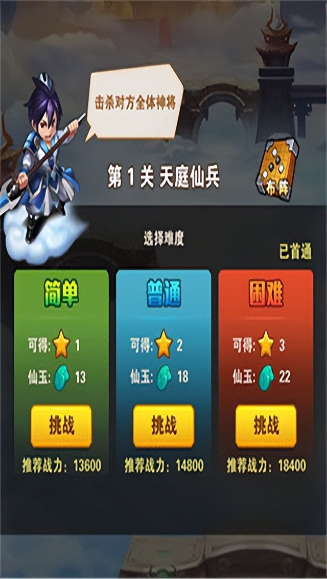 2、每一重天里面都有若干的小关卡,在挑战关卡之前,可以看到有3个难度供君选择,得到的奖励也不同,如果战力达到推荐战力,就尽量挑战高难度的关卡吧,可以获得更多的星星,至于为什么我会在后面告诉你。