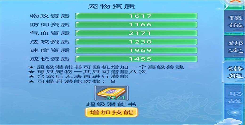 使用超级潜能书为宝宝增加技能,注意合宠后就无法再进行潜能,潜能需要宝宝等级达到30级
