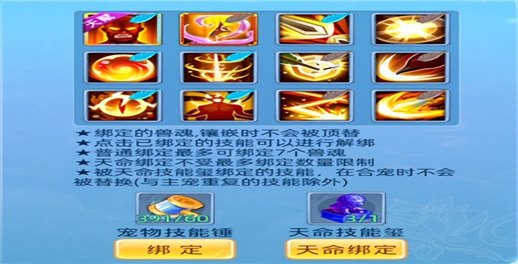 绑定:在镶嵌其他兽魂前,最好把需要的兽魂先进行绑定,可以使用宠物技能锤或者天命技能玺绑定,但需要注意当主宠的技能被天命技能玺绑定时,合宠才会保留下被天命绑定的兽魂技能