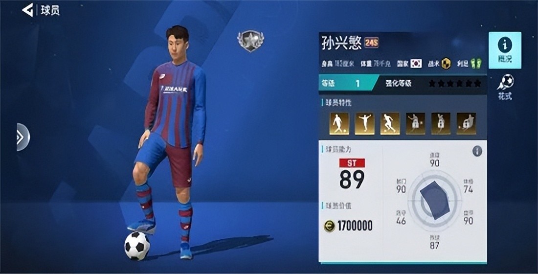 孙兴慜有爆趟的能力。91的盘带和控球让他在高速运球下仍能将球控制的很好。90的传球在边锋中是巅峰一样的存在。而92的射术和92的射门力量在边锋中更是罕见,明明是边锋却具有中锋的射门素质。超高的进攻意识,使得他在进攻中处于主导的作用。