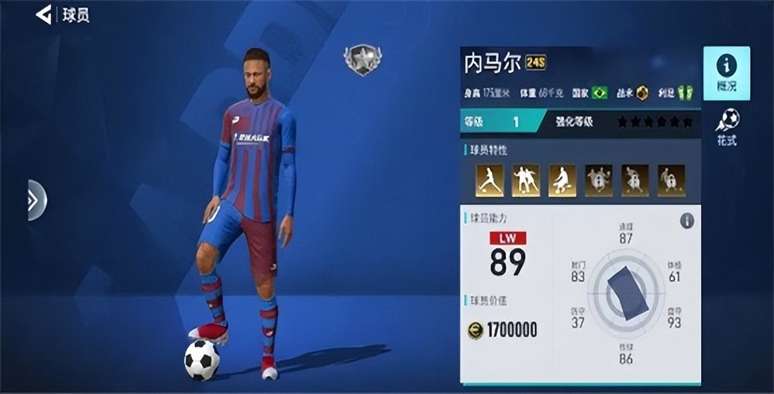 内马尔:说起桑巴足足球,没人会不知道内马尔,89的速度在边锋中也是不错的速度。95的盘带和94的控球在边锋中遥遥领先,传球方面,内马尔曾经作为巴萨的球员,在与队友短传配合方面也是顶级的。在之后的职业生涯中,内马尔的身体对抗能力也有所增强。拥有93的灵活的他,能够很自如地在比赛中辗转腾挪。