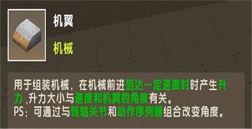 铰链方块只能用在机械中才会生效,通电后旋转面的方块会进行旋转。装在铰链方块旋转面的方块会被带动旋转,在飞行载具中,铰链方块可以用来带动机翼或者尾翼旋转,同时,用扳手点击铰链方块可以切换旋转方向。