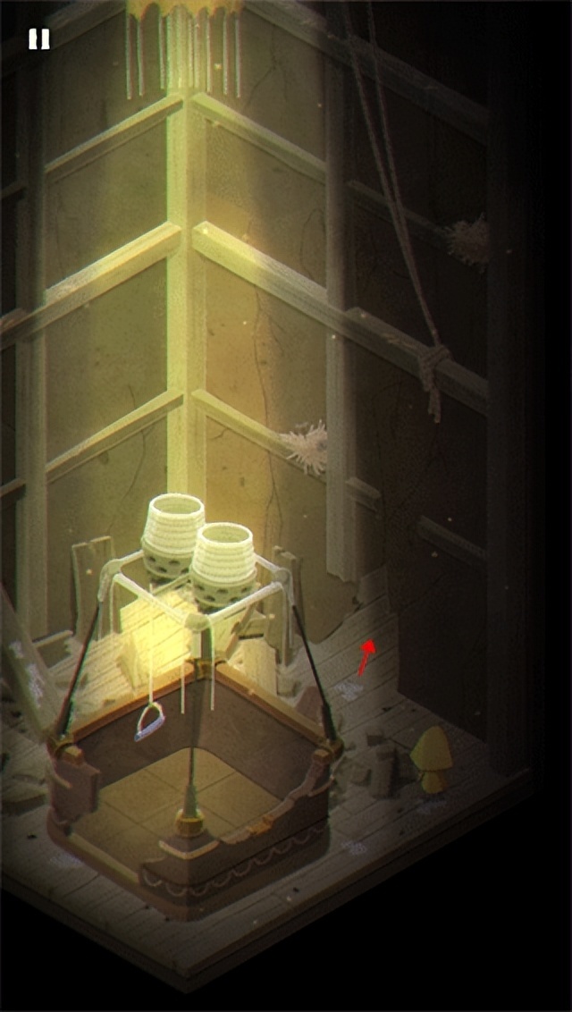 1、第一关,摩诺会出现在一个半吊起来的平台,我们需要按住上面的拉杆,让自己降落到地面上