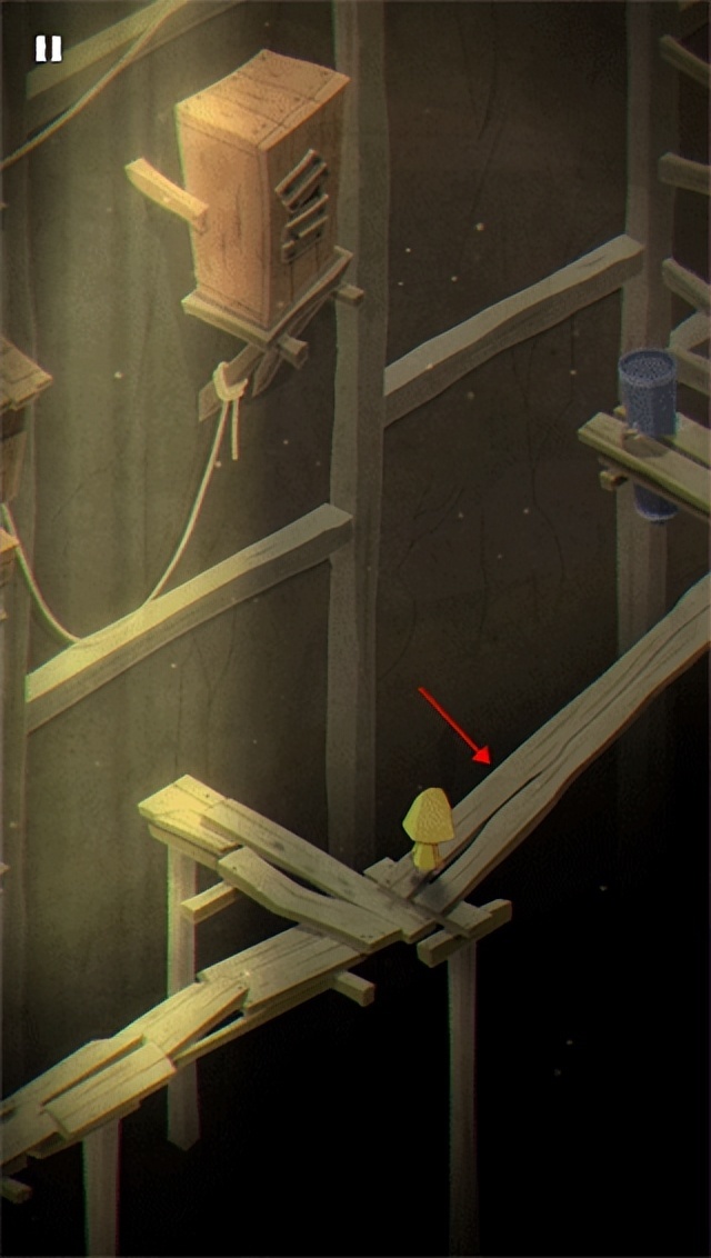 6、摩诺躲过桶,向楼梯往上爬,用力将这两块木板搬掉,就可以进入到下一个关卡了。