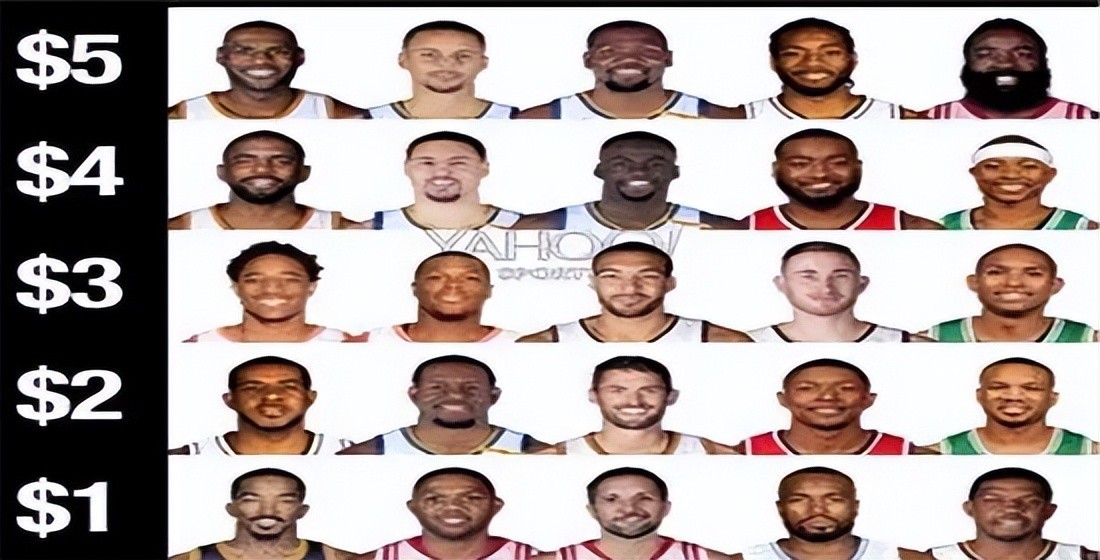 假如给您15$(即游戏内工资帽),您需要从下图不同价格档位(即游戏内工资)球员中选择五个组成您的首发阵容,您会怎么选?