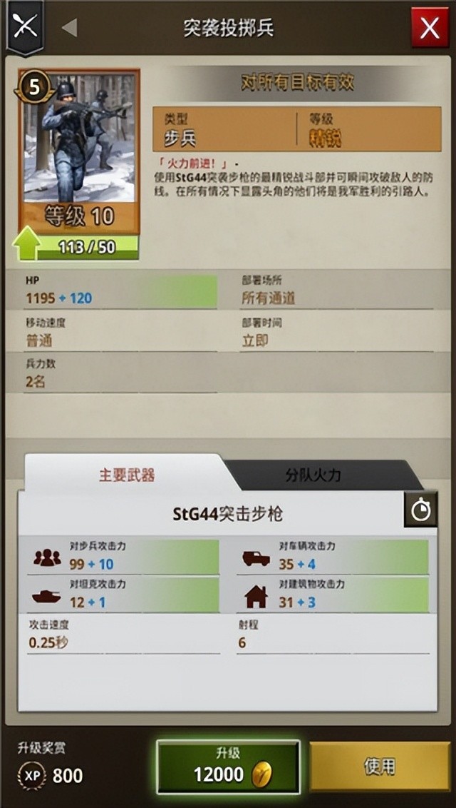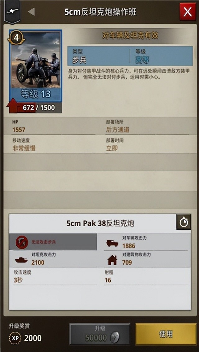德国步兵流核心,在有专属被动之后可以达到可怕的射程范围。可在远距离瞬间摧毁敌军装甲,其实应该是有被动的就是隐身到达指定地区暂停不动,可以获得隐身效果。下一次攻击伤害提高20%破除隐身之后开始移动。非常像特种近卫部队的渗透,不过这个效果在东线变成伪装反坦克炮阵地,但其实两个是同一个兵种。只不过一个是阵地。好言归正传,步兵阵容核心,不带这张牌打不过对面装甲流,心疼东线没有什么给远距离对敌方造成致命打击的反坦克步兵,要不是火箭炮持续,要么就是直接秒杀。卡牌定位可以看我那边的美军反坦克炮操作班,是一样的定位,都是阵容核心需要保护,前面已经说过相同的,就不再接着介绍了。