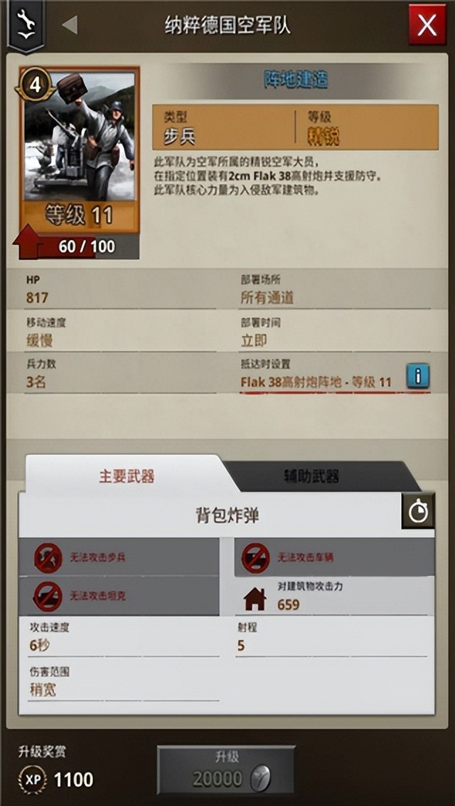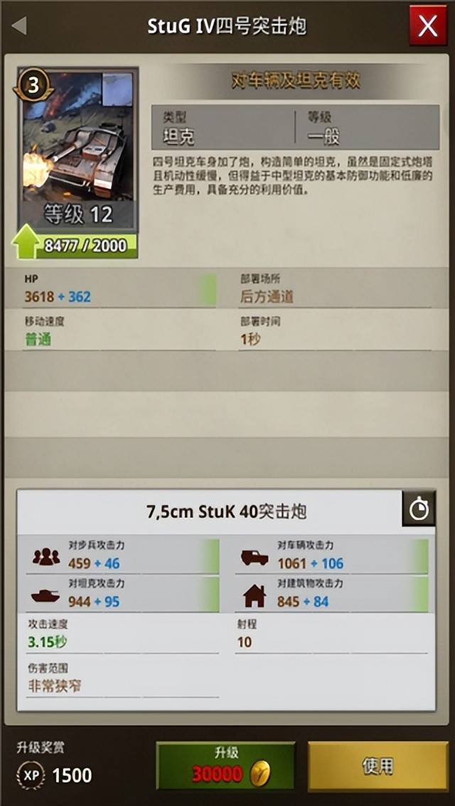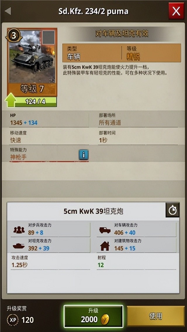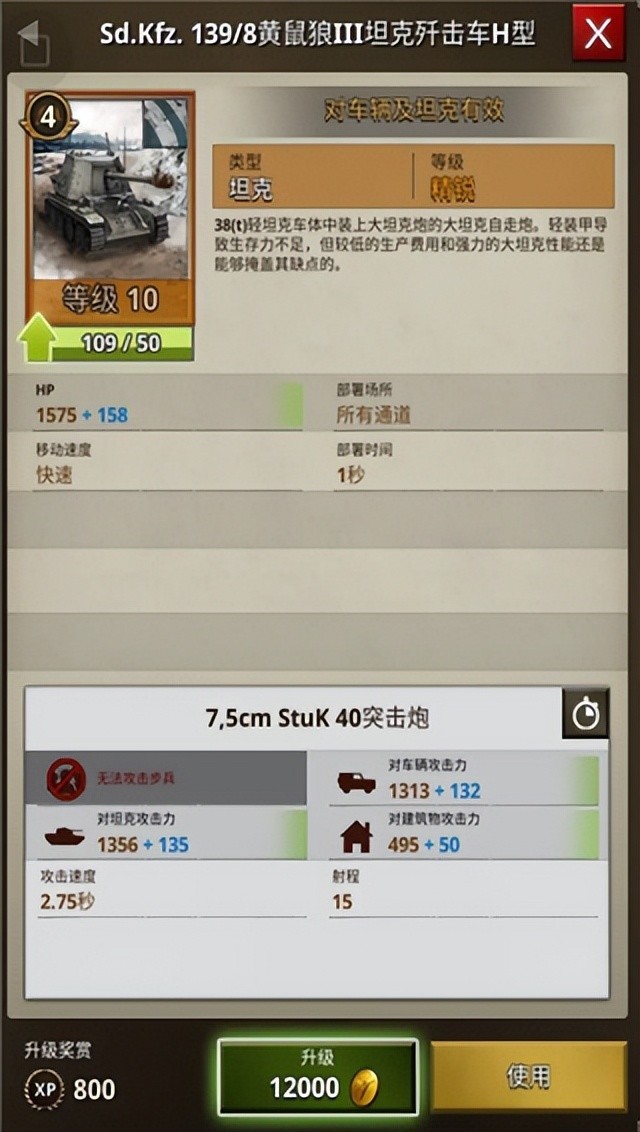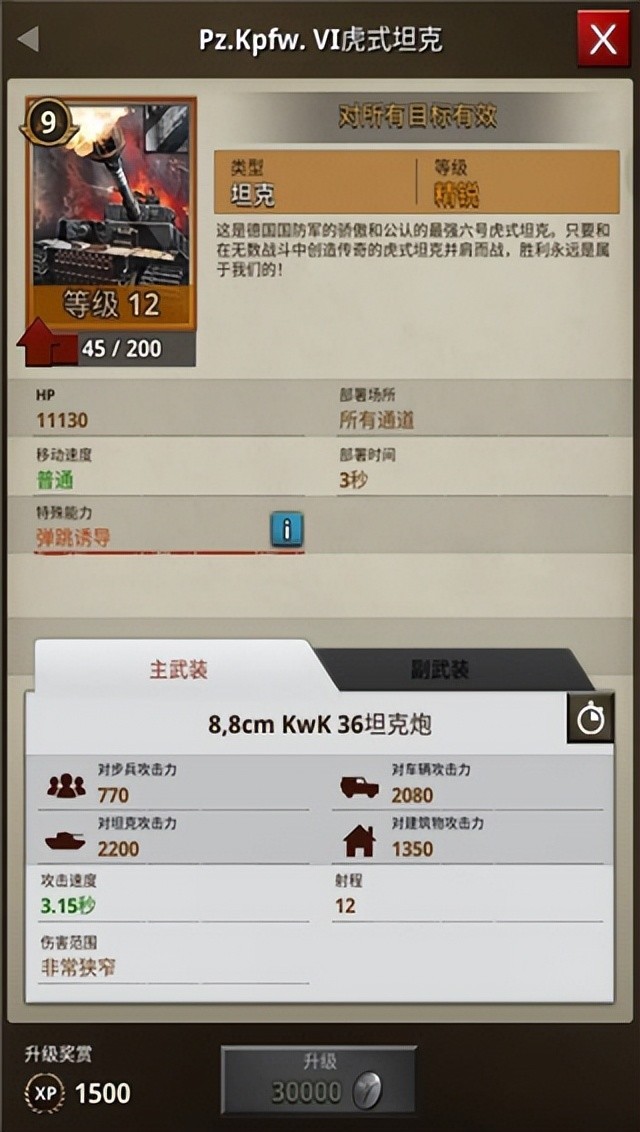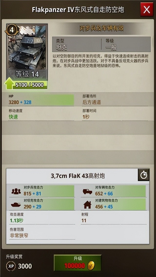 这张牌是德国国防军的核心牌之一,主要作用是用来解场,这张牌只能打步兵和一些比较没有风筝反坦克能力的车辆。如果这张牌单出的话,很容易会被解掉,毕竟主要作用其实并不是用来打步兵,一开始是设计出来防空的。所以自身很脆,两次反坦克武器直接抬走。作用就是当敌方的步兵,确认好攻击目标之后才出来解场。而且因为有着非常狭窄的攻击范围,所以可以对付比较弟弟的步兵群,人海流的克星之一。但是这张牌最关键的地方在于装甲突袭战术策略的被动,放置一个坦克时可以出现一个遥控炸弹,这个遥控炸弹将会成为第一次攻击目标。这个技能其实看上去非常的朴实无华,但实战之后才知道技能非常的有用。因为这个遥控炸弹会首先成为攻击目标,可以直接将对面的反坦克武器进入冷却强行拉一波对面的技能CD或者是主炮CD,就有更多机会可以输出,所以这张牌在装甲突袭策略人手中比间谍有用。普通的卡比较好升级,很容易到14级